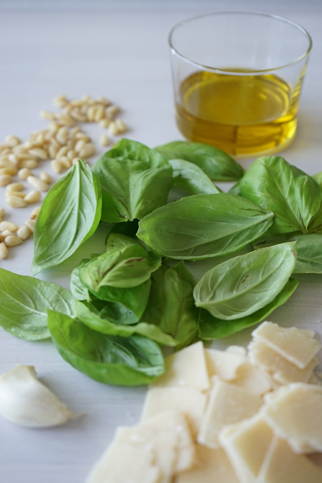 Instructions. Rincez et séchez les feuilles d'un gros bouquet de basilic pour en obtenir environ 50g. Placez les feuilles dans le mortier et écrasez les en faisant de petits mouvements circulaires ou. passez les au mixeur. Ajoutez les pignons de pin, la gousse d'ail épluchée et dégermée et la fleur de sel puis mixez ou écrasez à nouveau.